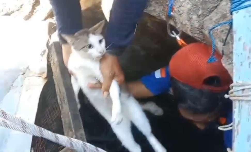 Meski begitu, kucing itu masih hidup karena berhasil bertahan di celah di dalam dinding sumur.