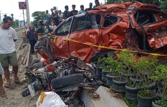 Kereta api KA Bangunkarta yang melintas menabrak satu mobil dan dua sepeda motor di perlintasan sebidang Jalan Raya Piyungan-Prambanan.