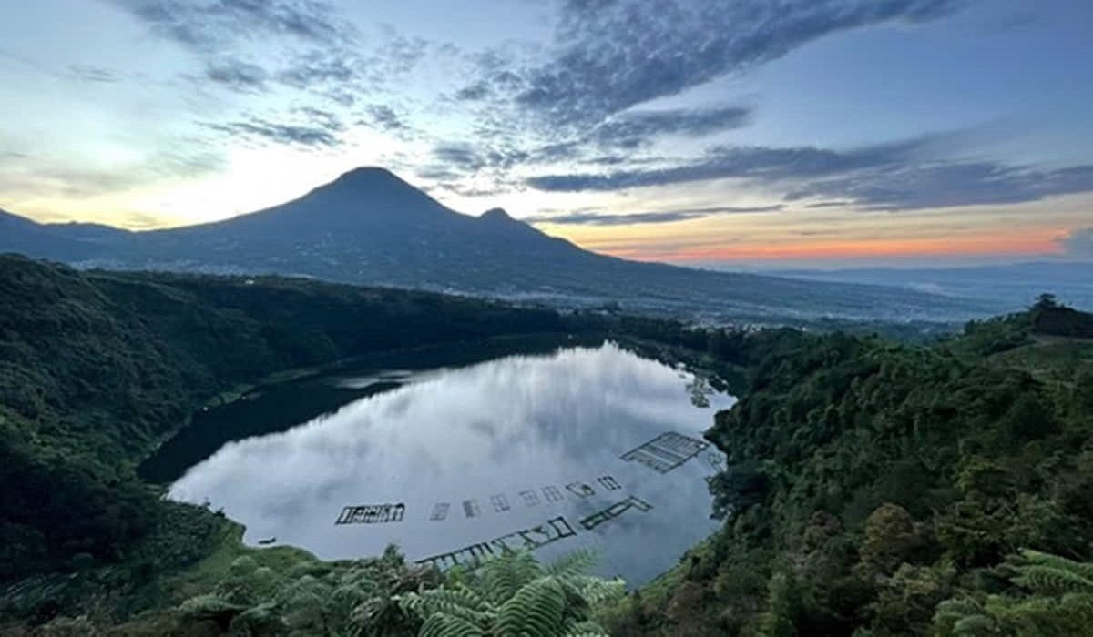 Kamu akan menyaksikan keajaiban saat cahaya keemasan memantul pada permukaan telaga dengan latar perbukitan hijau yang megah.