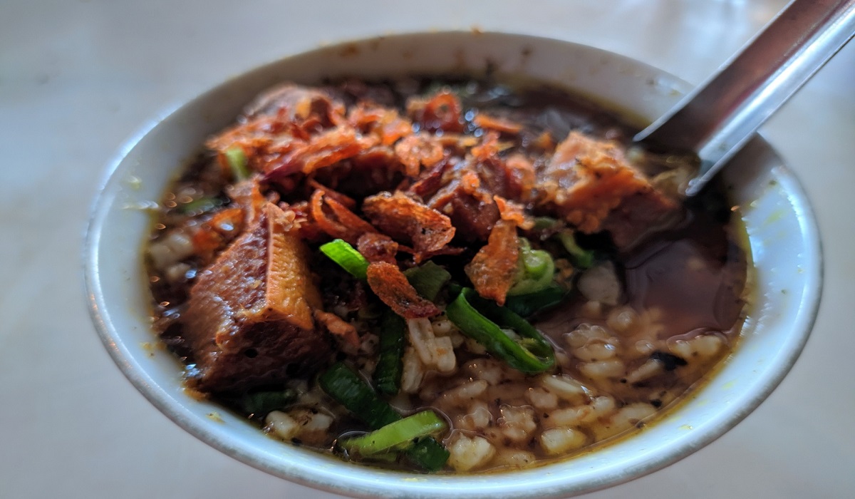 Dalam satu porsi nasi grombyang, Kamu akan menikmati nasi putih yang terendam banjir kuah rempah gurih dengan potongan daging sapi atau daging kerbau yang empuk.