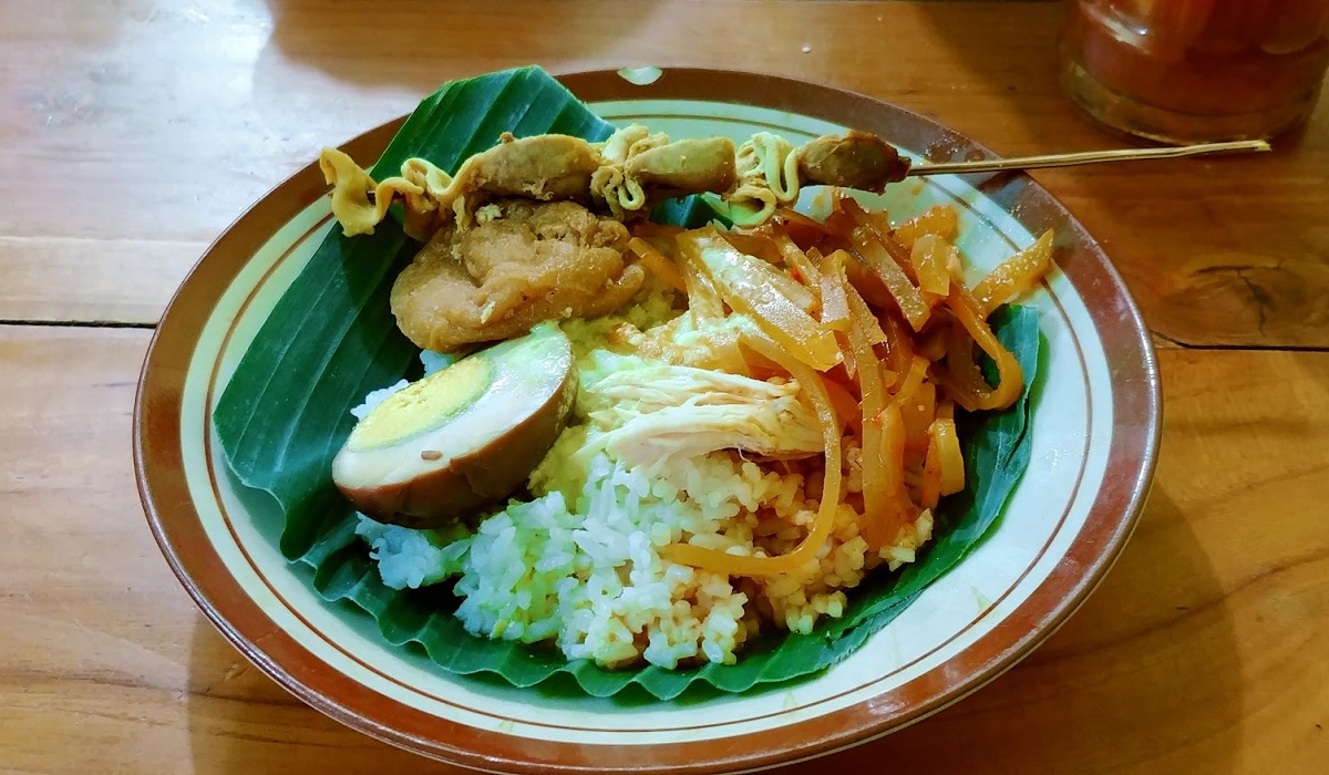 Kuliner Semarang yang satu ini menyajikan sepiring nasi hangat lengkap dengan ayam opor, telur pindang, krecek, dan sambal goreng yang gurih.